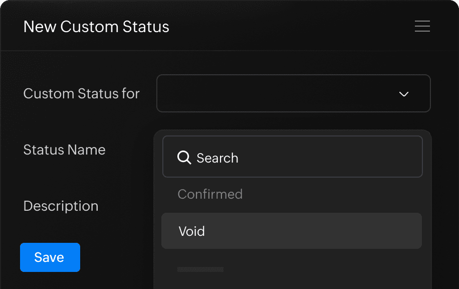 Zoho Books helps you set custom status for when the goods are delivered, dispatched, or when the sales order is invoiced.